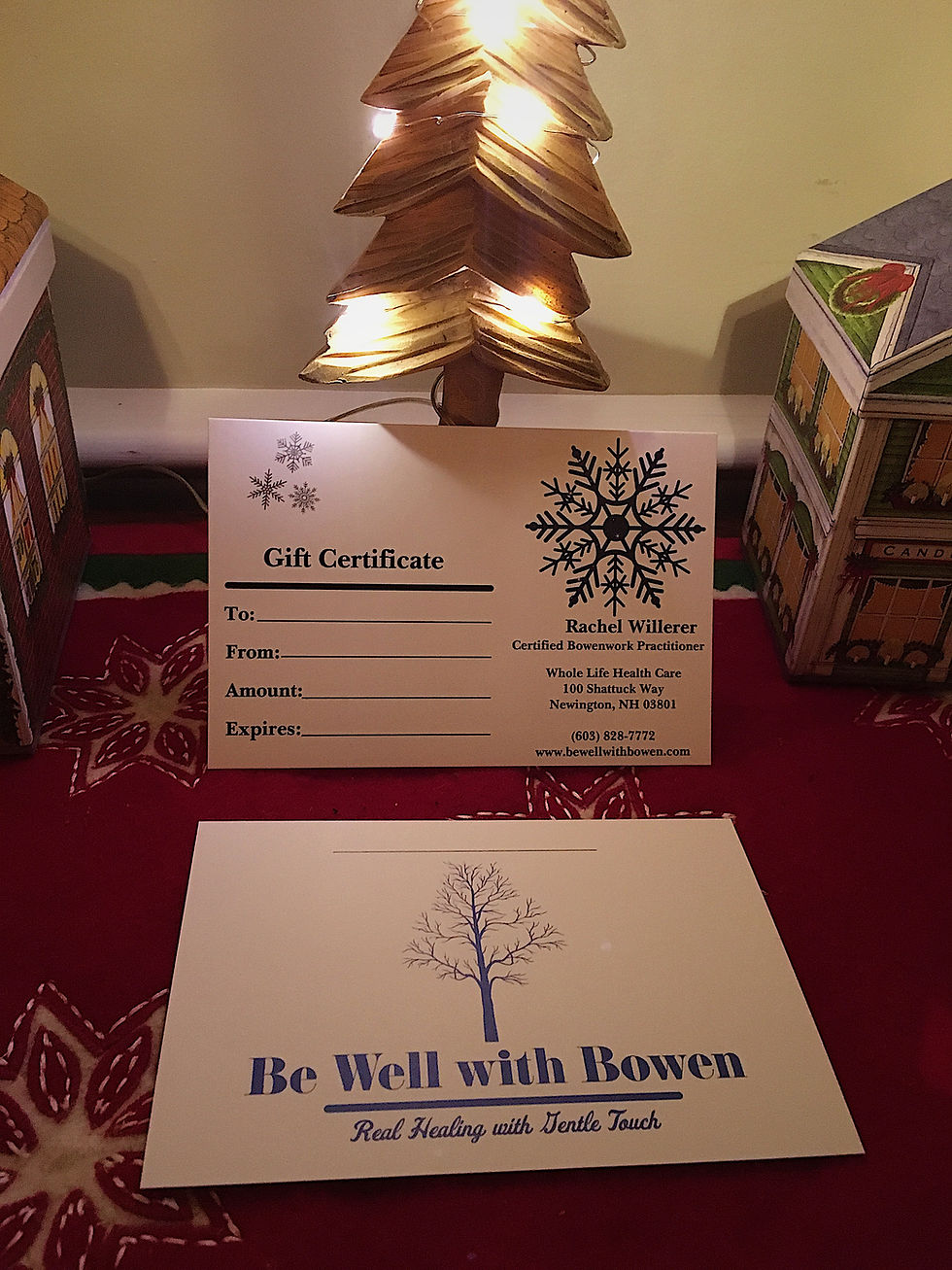 For the month of December I will be selling gift certificates for One Bowen Session for $50 (save $20!). Buy one for yourself and save a bit or treat someone you love (or just wish would get better!) to some relaxation and healing. I love Bowen and hope lots of other people do too!